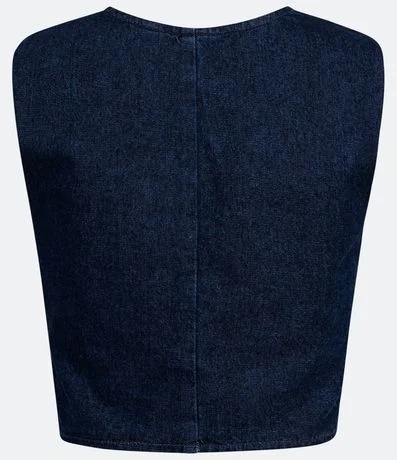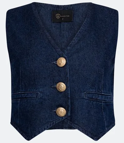 Ref: Colete jeans com decote V, sem manga, abotoamento frontal e sem estampa.