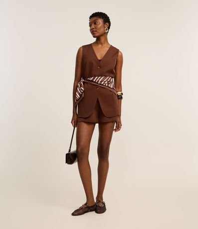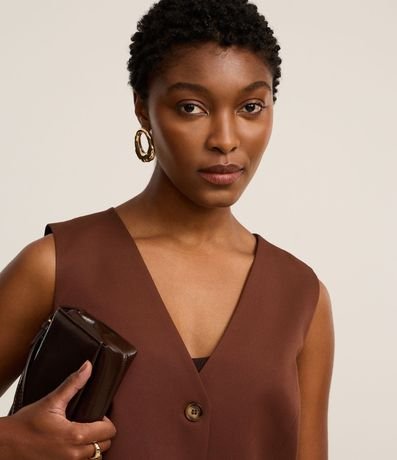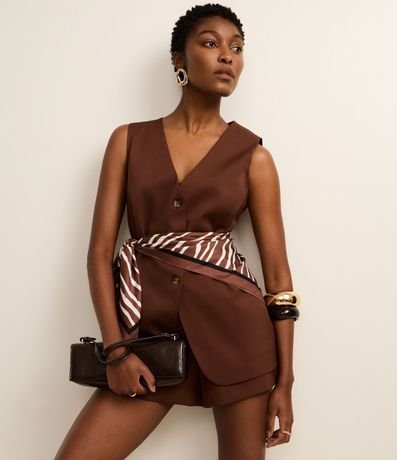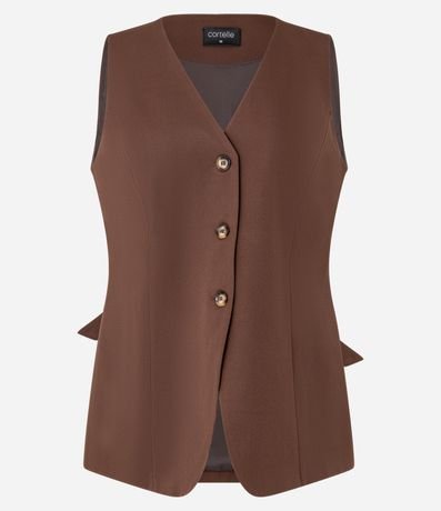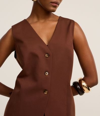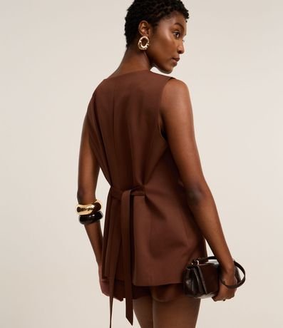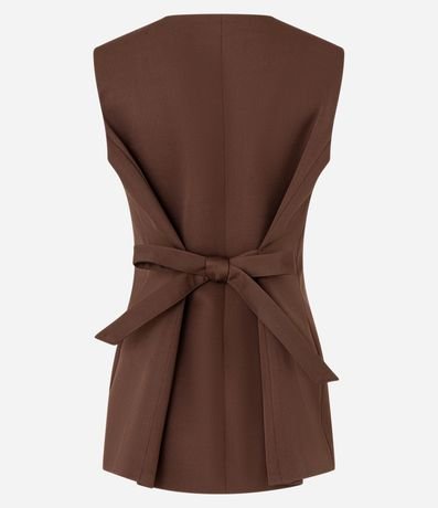 Ref: Colete alfaiatado, confeccionado em tecido plano, com gola V, botões frontais e amarração nas costas. Peça com comprimento mais longo.
