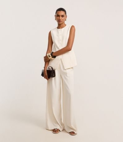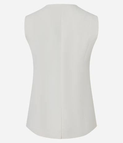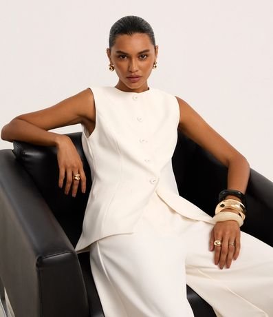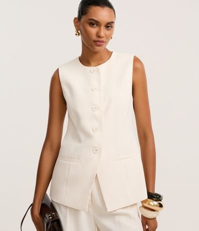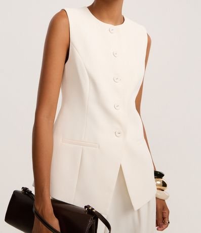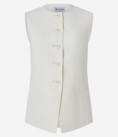 Ref: Colete longo com gola redonda, botões frontais forrados e bolsos frontais falsos.
