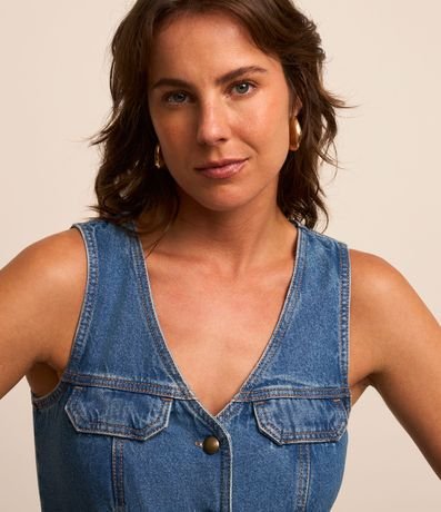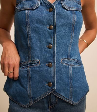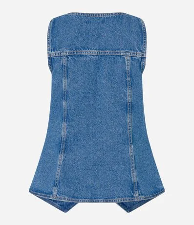 Colete alongado confeccionado em jeans com decote V, botões frontais para fechamento, recortes verticais, lapelas no peito e recortes frontais que parecem bolsos.