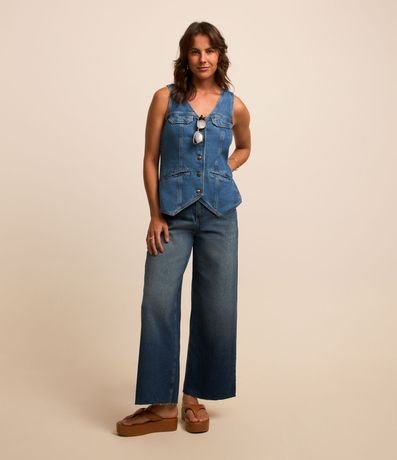 Colete Longo em Jeans com Botões e Barra Assimétrica