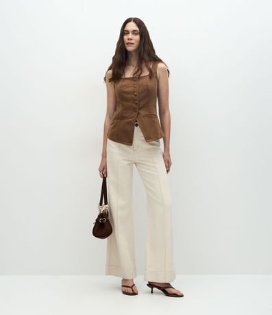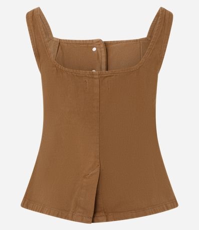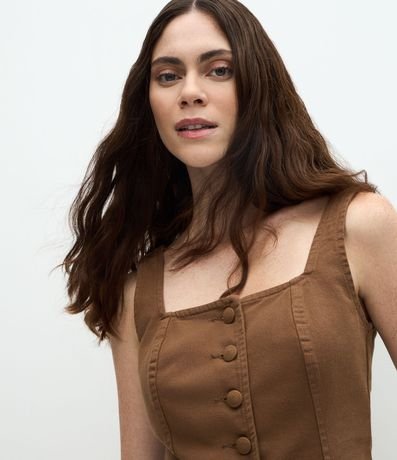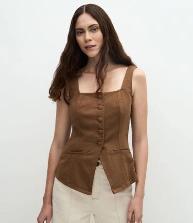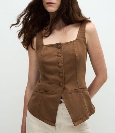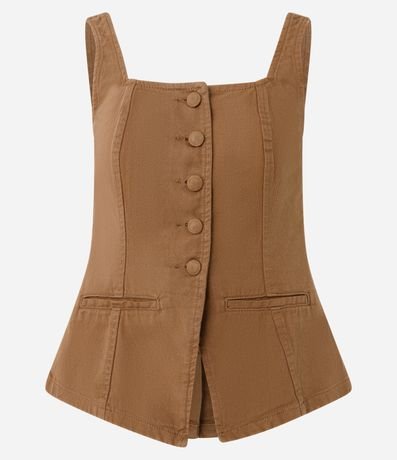 Ref: Colete confeccionado em algodão certificado BCI e boas práticas ambientais. Modelo regular com decote quadrado, alças largas e fechamento frontal com botões forrados. Possui recortes estruturados e bolsos decorativos, garantindo visual elegante e contemporâneo.