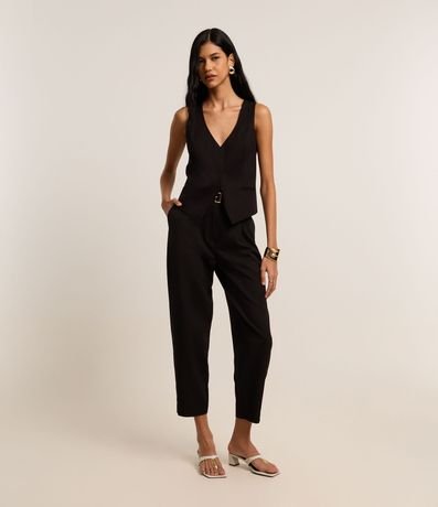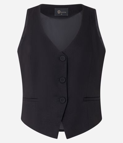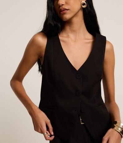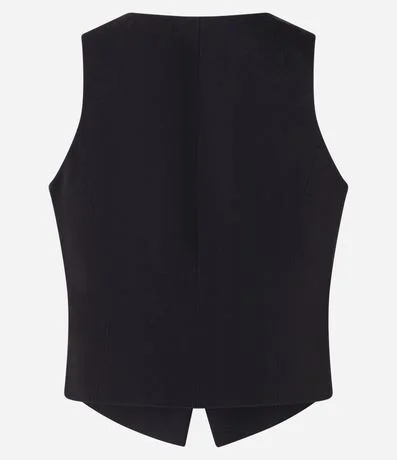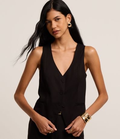 Ref: Colete slim curto, de estrutura alfaiatada, com decote V e barra assimétrica com recorte V invertido. Este produto possui viscose certificada em sua composição, sendo ambientalmente mais responsável.