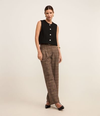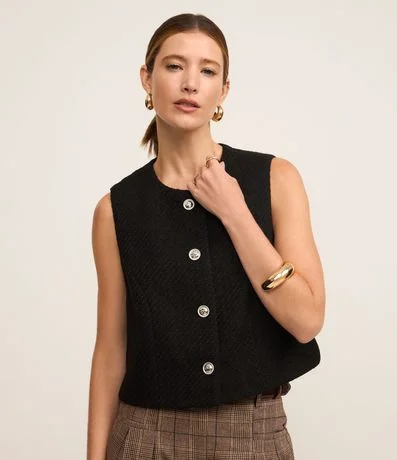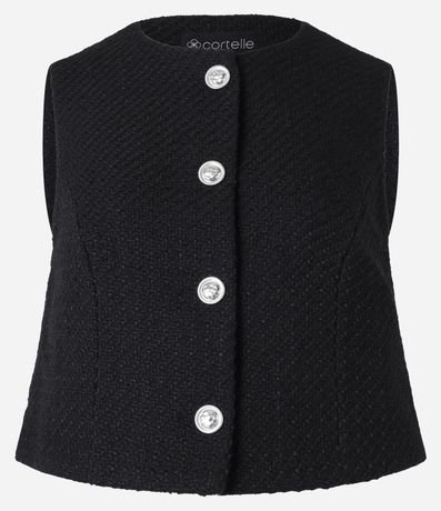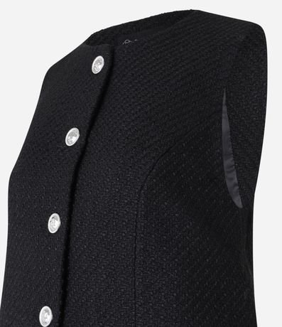 Ref: Colete confeccionado em tweed com gola redonda e abotoamento frontal. A roupa tem pences frontais e tecido todo texturizado.