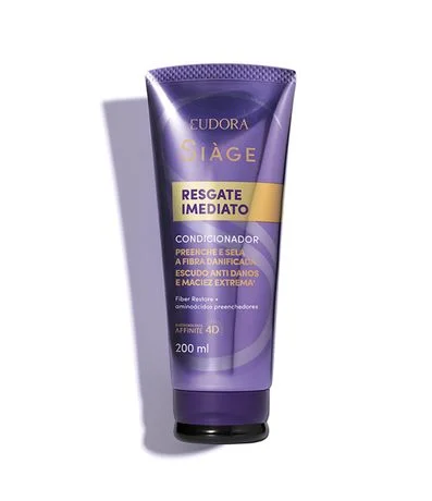 O condicionador de Eudora Siàge Resgate Imediato cria um filme protetor que impede o ressecamento do o e reduz a porosidade da fibra capilar. A linha Siàge Resgate Imediato chegou para revolucionar o tratamento dos cabelos. Ideal para todos os tipos de cabelo, sua fórmula foi desenvolvida para recuperar imediatamente os com danos que parecem não ter solução. Com Fiber Restore, que age desde o córtex capilar penetrando profundamente e criando pontes que suportam a estrutura da queratina interna, e Aminoácidos preenchedores, que preenchem a fibra capilar danicada, o uso da linha completa reduz a porosidade dos fios, devolvendo maciez extrema e garantindo cutículas totalmente seladas. Siàge. Tecnologia para o seu melhor cabelo, todos os dias. Nenhum produto Eudora é testado em animais, ou seja, este item possui selo Cruelty Free.
