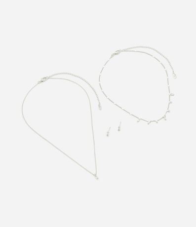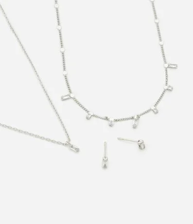 Ref: Conjunto com colar de duas camadas em zircônia, composto por pingentes chaton e par de brincos com ponto de luz.