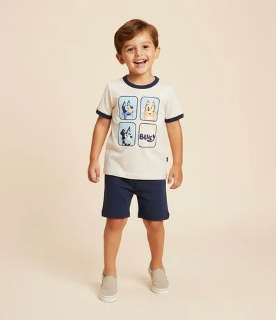Ref: Conjunto infantil confeccionado em cotton mais sustentável através de boas práticas ambientais, no modelo curto. Possui blusa com gola redonda, manga curta, víes em ribana, contrastante, estampa localizada e lettering "Bluey" e bermuda com cós elástico, cordão e sem estampa.