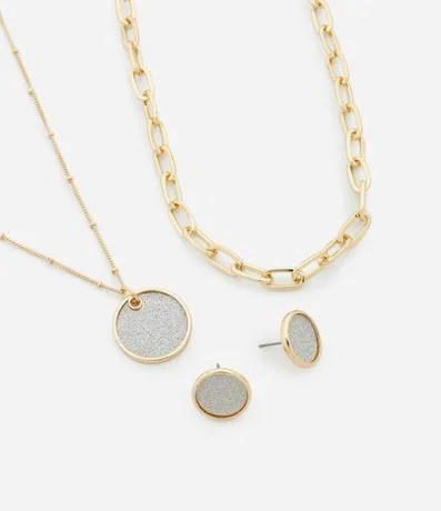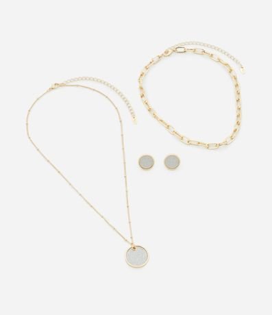 Ref: Conjunto de colar camadas e brinco, sendo um colar longo com bolinhas e pingente redondo com revestimento brilhoso, colar curto com corrente de elos acompanhado de brinco botão redondo com revestimento brilhoso. Produto confeccionado em metal reciclado.