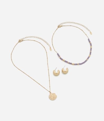Ref: Conjunto feminino com colar curto de corrente fina e pingente circular com textura orgânica. Acompanha segundo colar de contas e par de brincos de argola com fecho por pino.