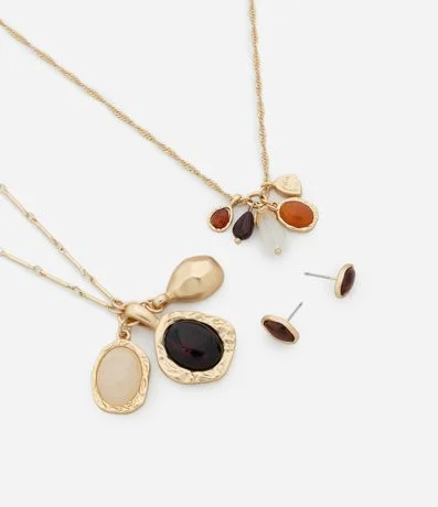 Ref: Conjunto feminino com colar em duas camadas: uma corrente singapura e outra com elos. Acompanha brinco pequeno em resina com base metálica.