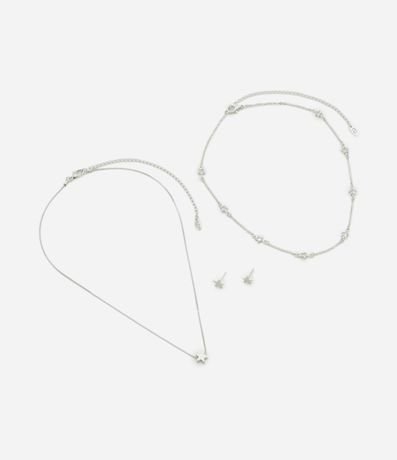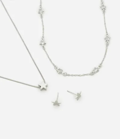 Ref: Conjunto de acessórios feminino com duas camadas de colares: uma corrente com pequenas aplicações de estrelas ao longo do comprimento e outra com pingente de estrela central. Acompanha brinco pequeno em formato de estrela.