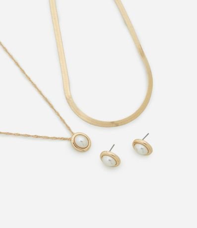 Ref: Conjunto de acessórios feminino confeccionados em metal reciclado mais sustentável. Possui 03 peças: 01 colar liso, 01 colar com pingente de pérola e 01 par de brincos pequenos também com pérola aplicada.