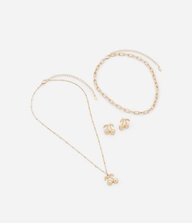 Ref: Conjunto de colar e brinco feminino, com colar camada sendo: 01 colar curto de elos, 01 colar longo de esferas e um par de brincos cerejas.