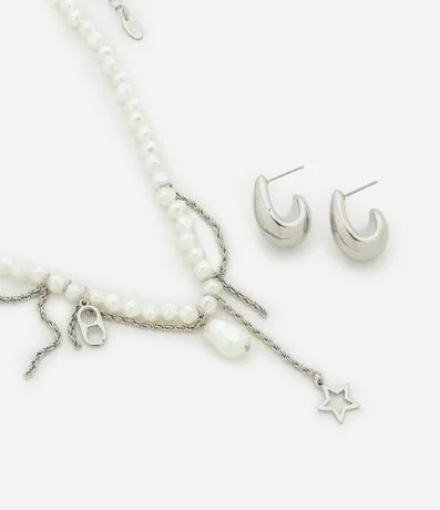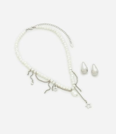 Ref: Conjunto de colar e brinco, sendo colar com pérolas artificiais, corrente com pingentes acompanhado de par de brincos argola.