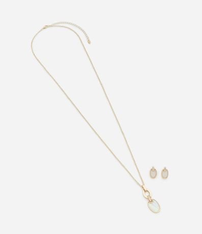 Ref: Conjunto de colar e par de brincos confeccionados em metal reciclado mais sustentável. São 02 peças: 01 colar com corrente fina e pingente oval claro, com brilho suave, preso por argola também dourada; 01 par de brincos pequenos, ovais, com borda contrastante e detalhe de pedrinhas brilhantes no topo. Conjunto delicado, elegante e fácil de usar no dia a dia.