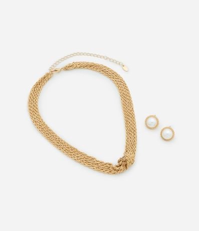 Ref: Conjunto de colar curto com 05 corrente singapura com nó acompanhada de par de brincos botão com perola artificial no centro.