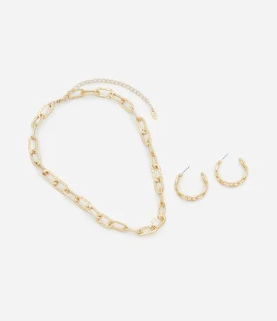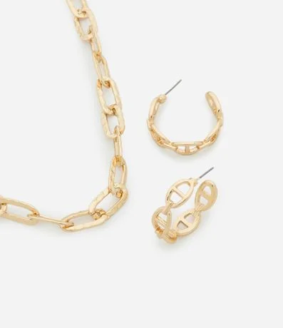 Ref: Conjunto de colar curto com corrente de elos acompanhada por par de brinco argola com a mesma proposta de elos. Produto confeccionado em metal reciclado.