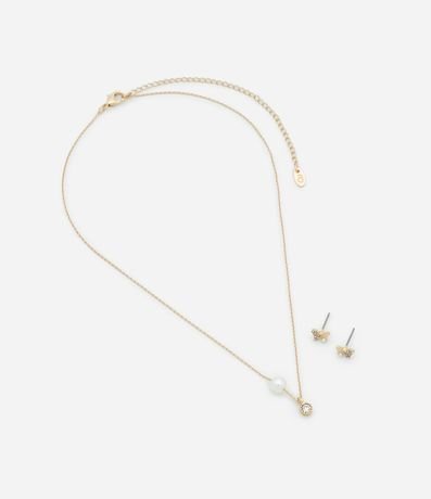 Conjunto de colar curto com pingente de strass com pérola artificial acompanhado de brinco botão com forma de borboleta e strass.