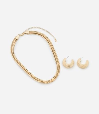 Ref: Conjunto de colar curto com corrente dupla no estilo relógio acompanhada de par de brincos argola com textura de riscas. Produto confeccionado por metal reciclado.
