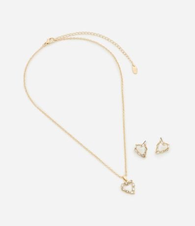 Conjunto de colar curto com pingente de coração vazado com strass e par de brincos com forma de coração vazado com strass.