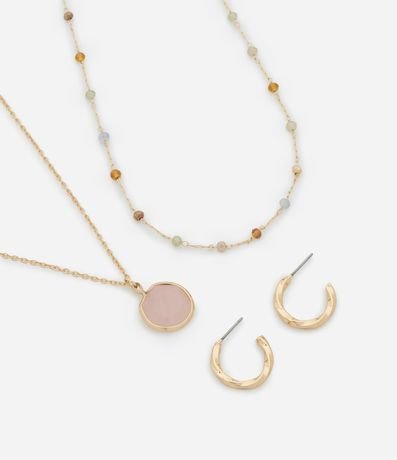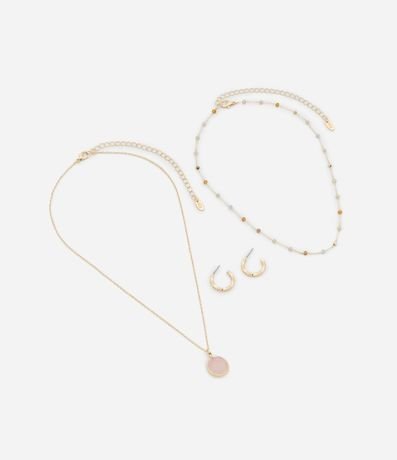 Ref: Conjunto de bijuteria com brinco e colar duplo. Brinco argola pequena, efeito torcido e colar com 2 camadas, 1 camada com corrente com bolinhas coloridas e outra com corrente fina e Pedra Natural.