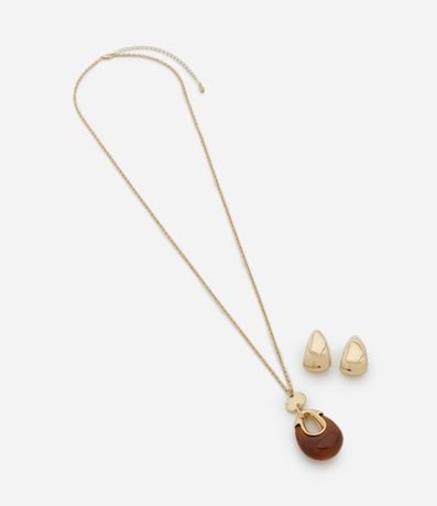 Ref: Conjunto de colar longo com pingente gota e detalhe em resina, e brinco argola bold.