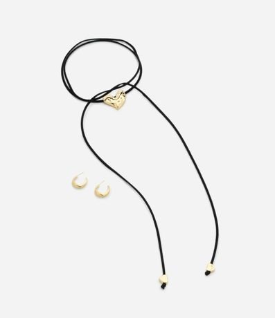 Conjunto feminino com colar longo de cordão suede, trazendo pingente de coração metálico e ponteiras também em formato de coração. Acompanha brincos argola.