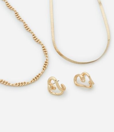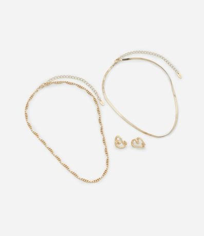 Ref: Conjunto de colar e brinco, sendo um colar fita, um colar com corrente detalhada acompanha de par de brincos botão em forma de coração. Peça confeccionada em metal reciclado.