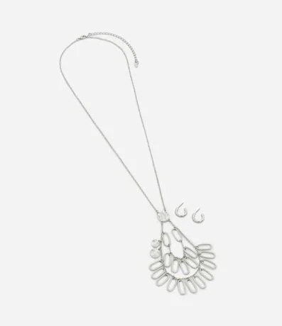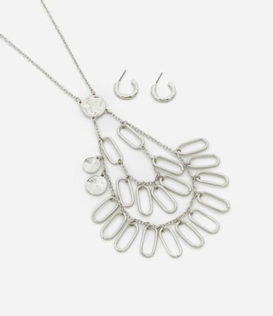Ref: Conjunto de acessório feminino confeccionado em metal reciclado, contém colar longo com pingentes ovais, corrente com elos acompanhado de par de brincos argola com efeito martelado.