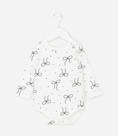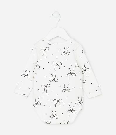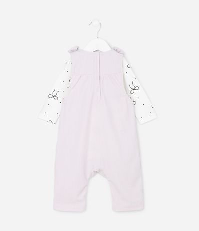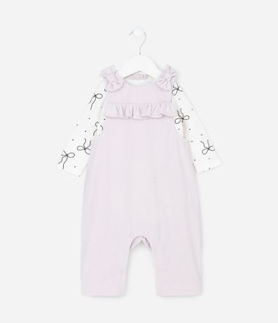 Ref: Conjunto infantil composto por body de manga longa com gola americana e estampa de laços, acompanhado de jardineira longa em cotelê macio com babado frontal e laços aplicados nas alças. Body com fechamento entrepernas e jardineira com abertura inferior. Material mais sustentável: PET reciclado.
