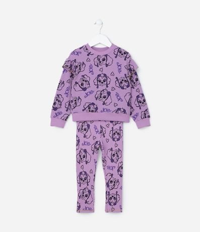 Ref: Conjunto infantil de modelo longo, confeccionado em moletom sem forro, de material algodão mais responsável e composto por blusão e calça. Possui babadinho e estampa da Skye, da Patrulha Canina.