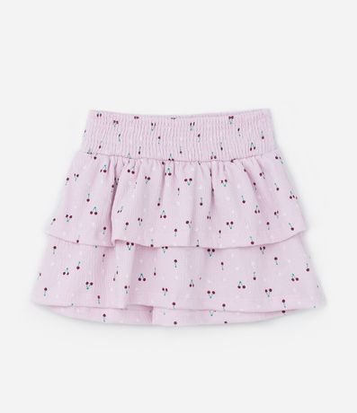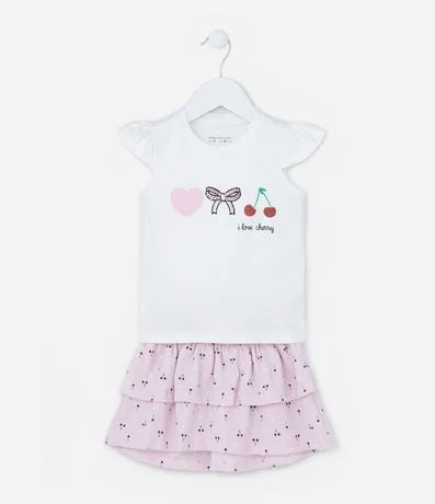 Ref: Conjunto Infantil confeccionada em algodão mais sustentável, composto de blusa e saia. Possui blusa de gola redonda, manga curta, com babadinhos, bordado em paetê e saia com babados e estampa de mini cerejinhas.