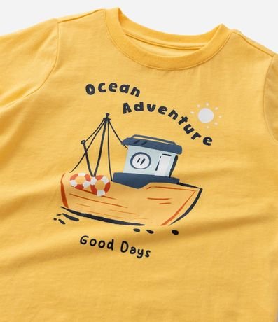 Ref: Conjunto de verão infantil composto por duas peças: camisetinha com mangas curtas e bermuda de microfibra com elástico e amarração na cintura. Tudo estampado temático barquinhos.