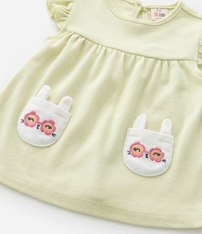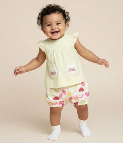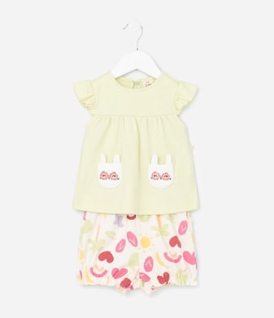 Ref: Conjunto infantil confeccionado em algodão mais sustentável através de boas práticas ambientais, no modelo curto. Possui blusa no modelo bata, com gola redonda, fechamento gota, manga curta, bolsinho com estampa de bichinho. Shortinho com cós e barra com elástico e estampado.