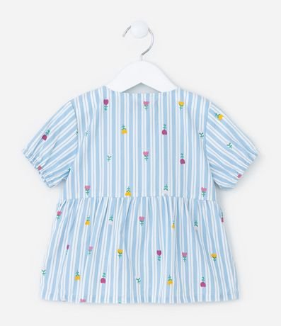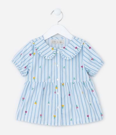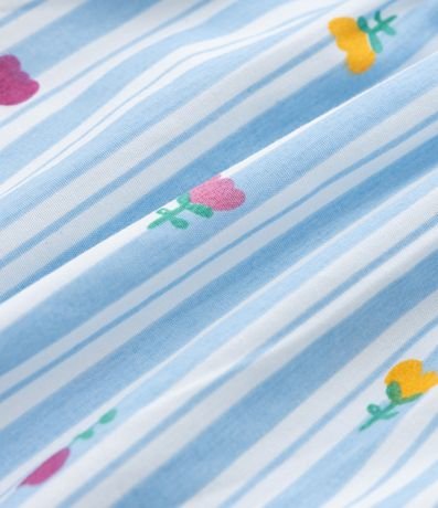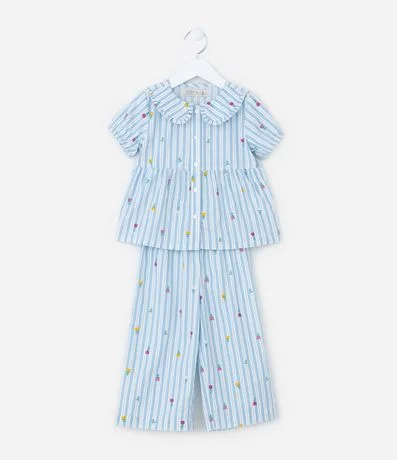 Ref: Conjunto infantil confeccionado em tricoline, composto de blusa e calça. A blusa conta com goal boneca, manga curta e fechamento por botões, já a calça possui cós elástico. Ambas as peças possuem estampa listrada com flores.