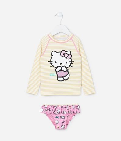 Ref: Conjunto de biquíni infantil confeccionado em microfibra, com proteção UV e composto por 02 peças: top e calcinha. Possui estampa da Hello Kitty e calcinha com babadinhos.