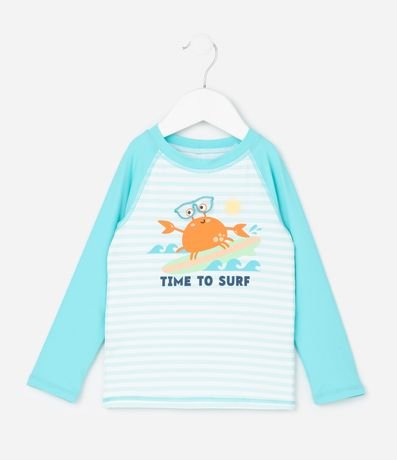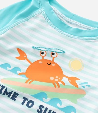 Ref: Conjunto de praia infantil, confeccionado em poliamida com 03 peças: camiseta, sunga e chapéu. Camiseta com estampa de siri, listradinha, sunga possui estampa localizada e chapéu com cordão contrastante.