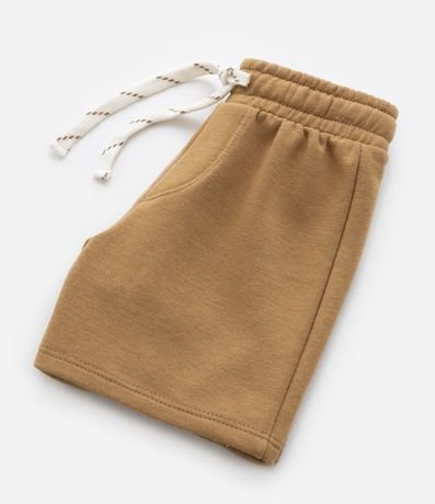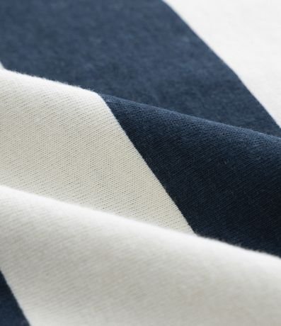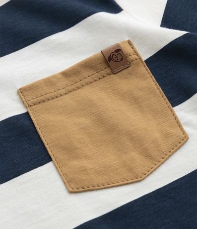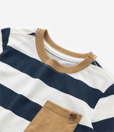 Conjunto infantil de modelo curto, confeccionado em malha de algodão mais responsável e composto por duas peças: bermuda e camiseta. A camiseta possui gola redonda, manga curta, padronagem de listras largas e bolsinho frontal contrastante. A bermuda conta com cós elástico, amarração na cintura e texturinha.