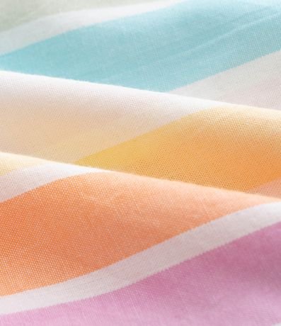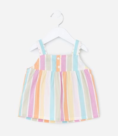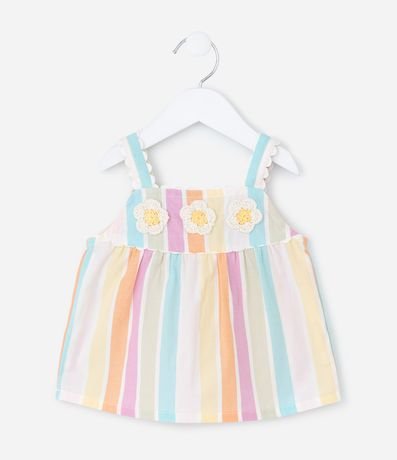 Ref: Conjunto infantil confeccionado em tricoline mais sustentável, sendo composto por blusa de alças com frufru, aplicações de florzinhas em crochê e shortinho com cós elástico. Ambos possuem estampa de listras.