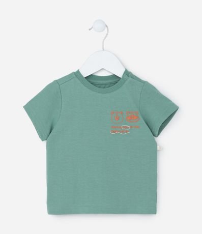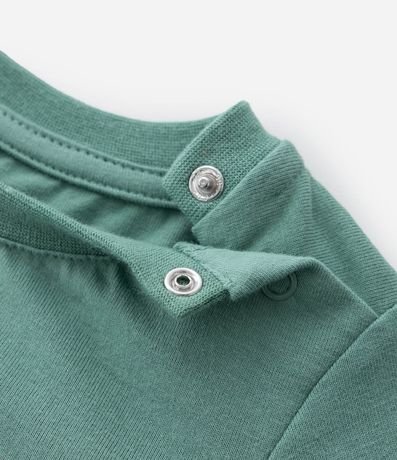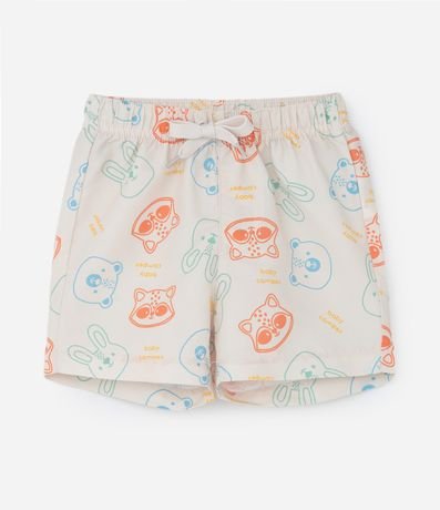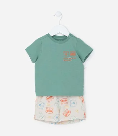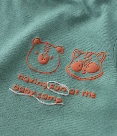 Conjuntinho infantil confeccionado em malha de algodão mais responsável e composto por 02 peças: Camiseta e bermuda. A camiseta possui gola redonda, mangas curtas, abertura por botões no ombro e estampa em relevo localizada no peito. A bermudinha conta com cós elástico, amarração na cintura e estampa full print com carinhas de bichos.
