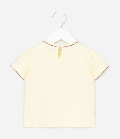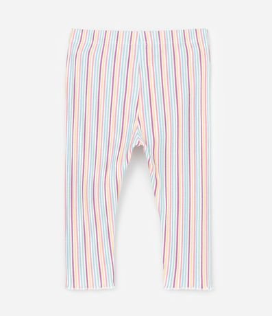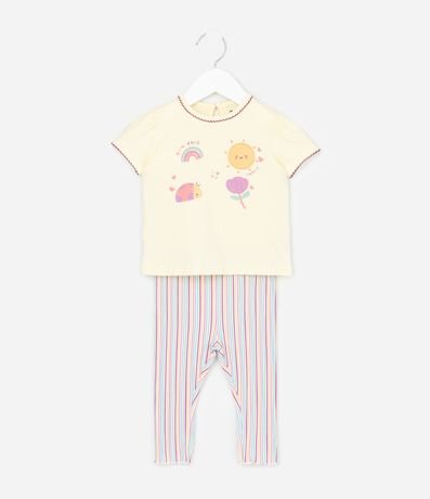 Conjunto infantil confeccionado em malha de algodão e composto por 02 peças: Camiseta e Calça. A camiseta possui gola redonda, mangas curtas, abertura em gota nas costas, estampa de ícones fofinhos e detalhe de costuras contrastantes nas mangas e gola. A calça de modelo legging conta com cós elástico e padronagem de listras verticais.