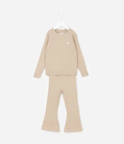 Conjunto infantil confeccionado em efeito tricô macio com viscose certificada, oferecendo toque aconchegante e caimento confortável. O casaco possui gola redonda, mangas longas e coração bordado, enquanto a calça flare traz cós elástico e textura trançada que adiciona charme ao visual.
