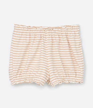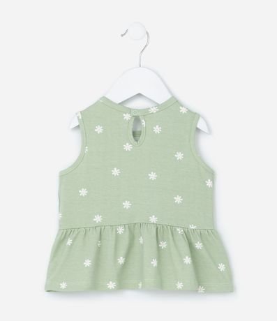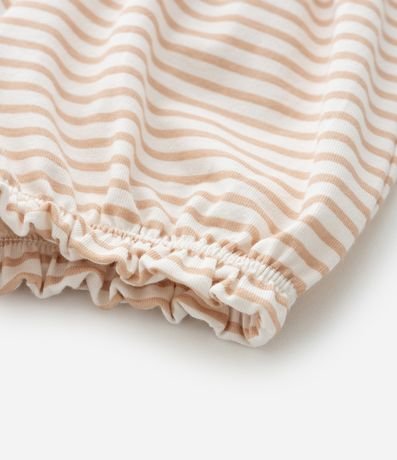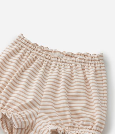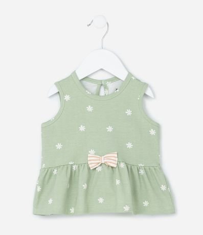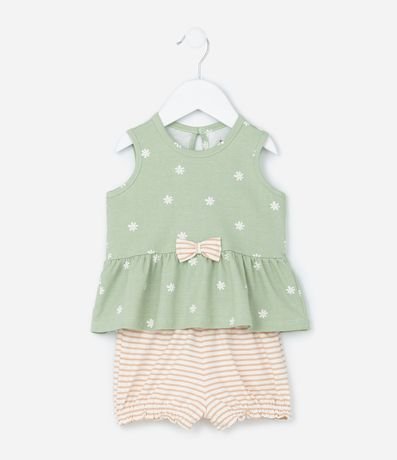Ref: Conjuntinho infantil para bebês, confeccionado em malha de algodão com elastano e composto por 02 peças: blusinha e short. A blusa de modelo regata possui gola redonda, abertura em gota nas costas, recorte franzido na cintura, estampa de florzinhas e aplicação frontal de lacinho. O short estilo bombachinha conta com elástico no cós e na barra, e padronagem de listras.