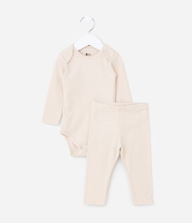 Ref: Conjunto longo para bebês composto de: body manga longa com gola americana e fechamento entrepernas; e calça com cintura elástica. A peça não possui estampa e é confeccionada em material mais sustentável e com boas práticas ambientais.