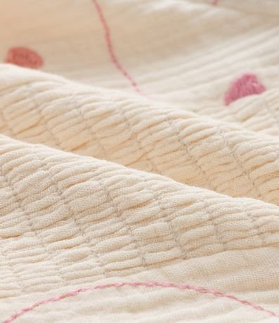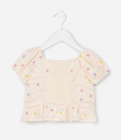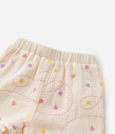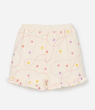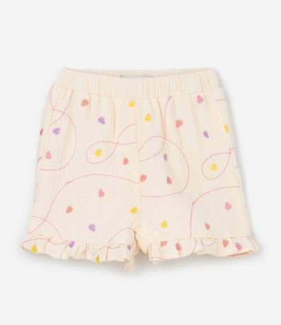 Ref: Conjunto infantil confeccionado em tricoline mais sustentável, no modelo curto. Possui blusa bata com decote quadrado, manga curta, com elástico, babadinho na barra e shortinho com cós elástico e babadinhos na barra. Ambos possuem estampa bordada de corações e texturizados.
