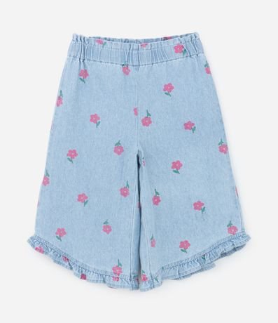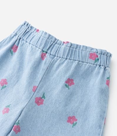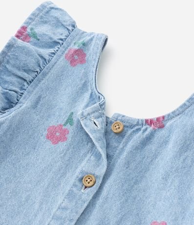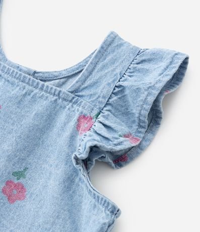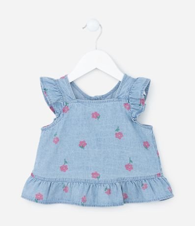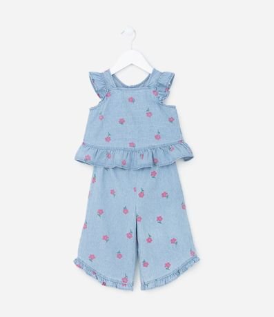 Ref: Conjunto infantil confeccionado em jeans, composto de blusa e calça. Blusinha com decote quadrado, mangas e barra com babadinhos, já a calça possui cós elástico e babadinho na barra também. Possui estampa de florzinhas.