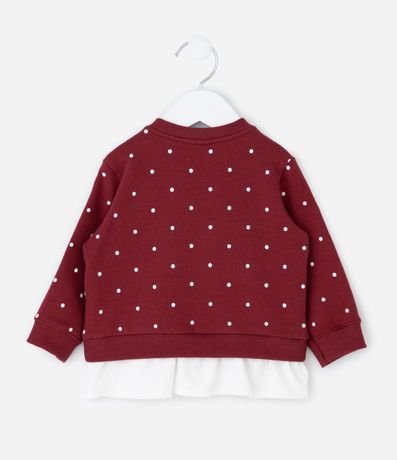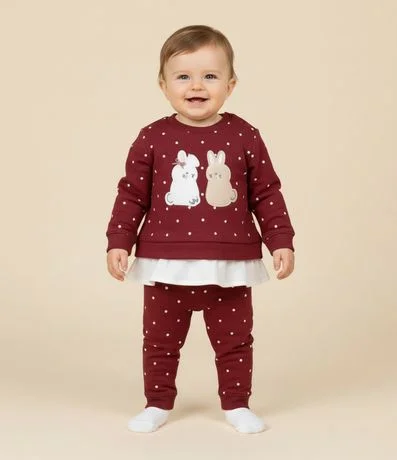 Ref: Conjunto infantil confeccionado em algodão certificado BCI, com moletom felpado macio e confortável. O casaco possui gola redonda, mangas longas e aplicação de coelhinhos, além de poá por toda a peça e abertura no ombro. A calça tem cós elástico e poá coordenado.