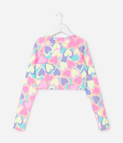 Ref: Conjunto infantil composto por blusa manga longa com proteção UV50+, confeccionada em poliéster leve e estampa de corações em toda a superfície. Possui zíper frontal curto e acabamentos reforçados. Acompanha calcinha de biquíni em microfibra com forro interno e cintura elástica.