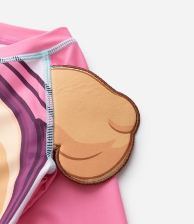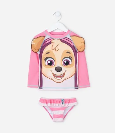 Ref: Conjunto infantil UV confeccionado em microfibra leve com elasticidade, ideal para praia e piscina. A blusa possui gola redonda, mangas longas e estampa temática. A Skye é a corajosa cockapoo de sete anos que atua como especialista em resgates aéreos na Patrulha Canina. Pilotando seu helicóptero ou usando sua mochila a jato, na série que celebra brincadeiras e imaginação. A calcinha tem babado, forro interno e cós confortável.