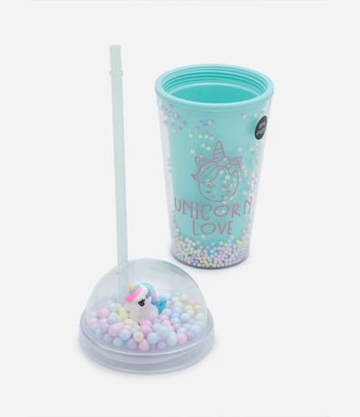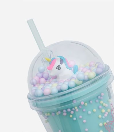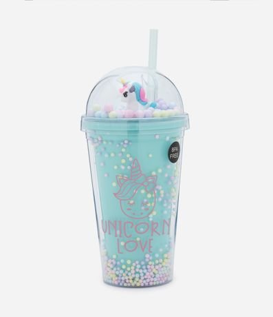 Ref: Copo plástico com canudo reutilizável, parede dupla com bolinhas coloridas e tampa redonda com bolinhas e unicórnio.